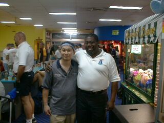 写真2枚目は、パーフェクト達成のジョンソン選手(右)とよこちん(左)。